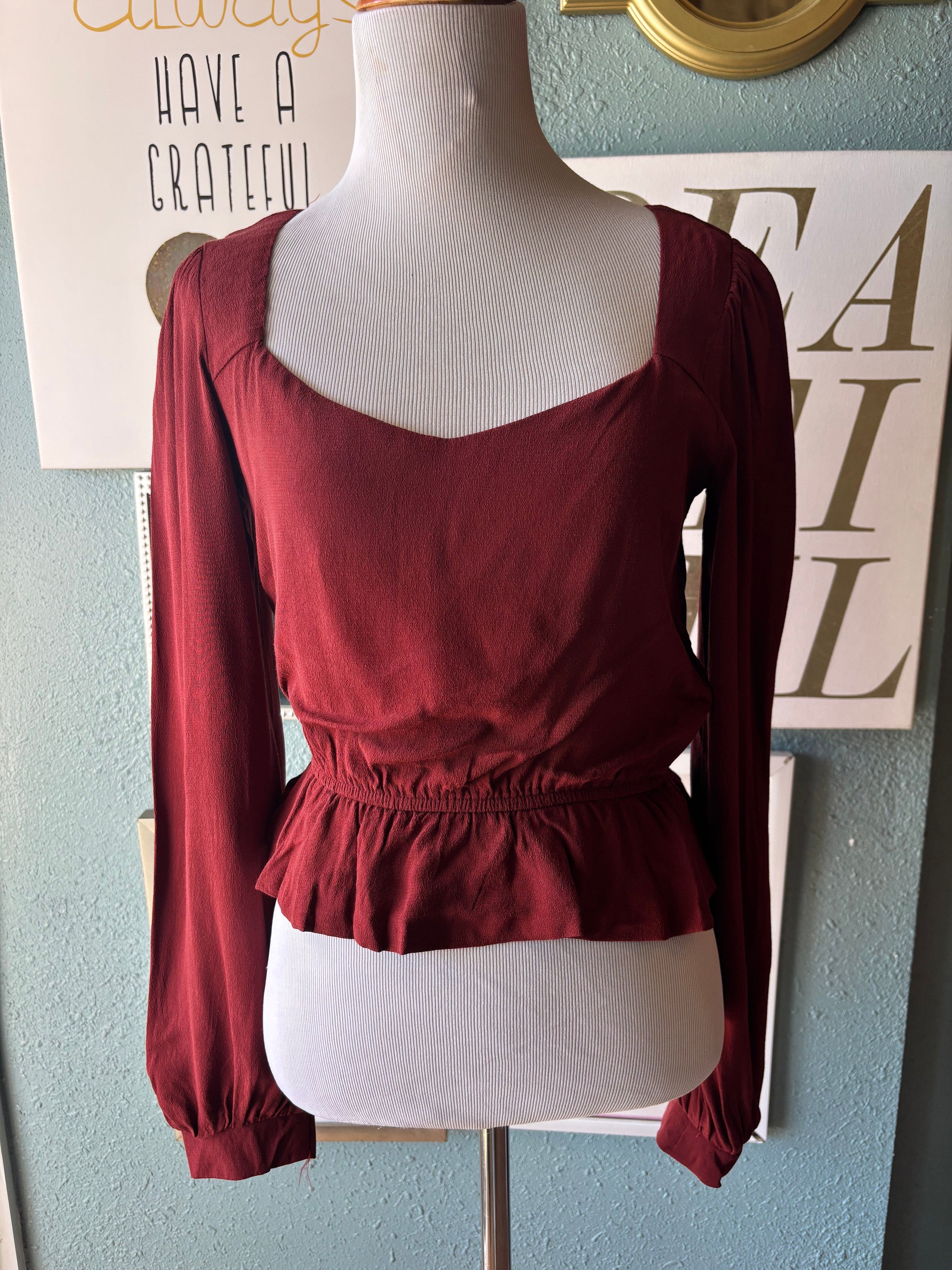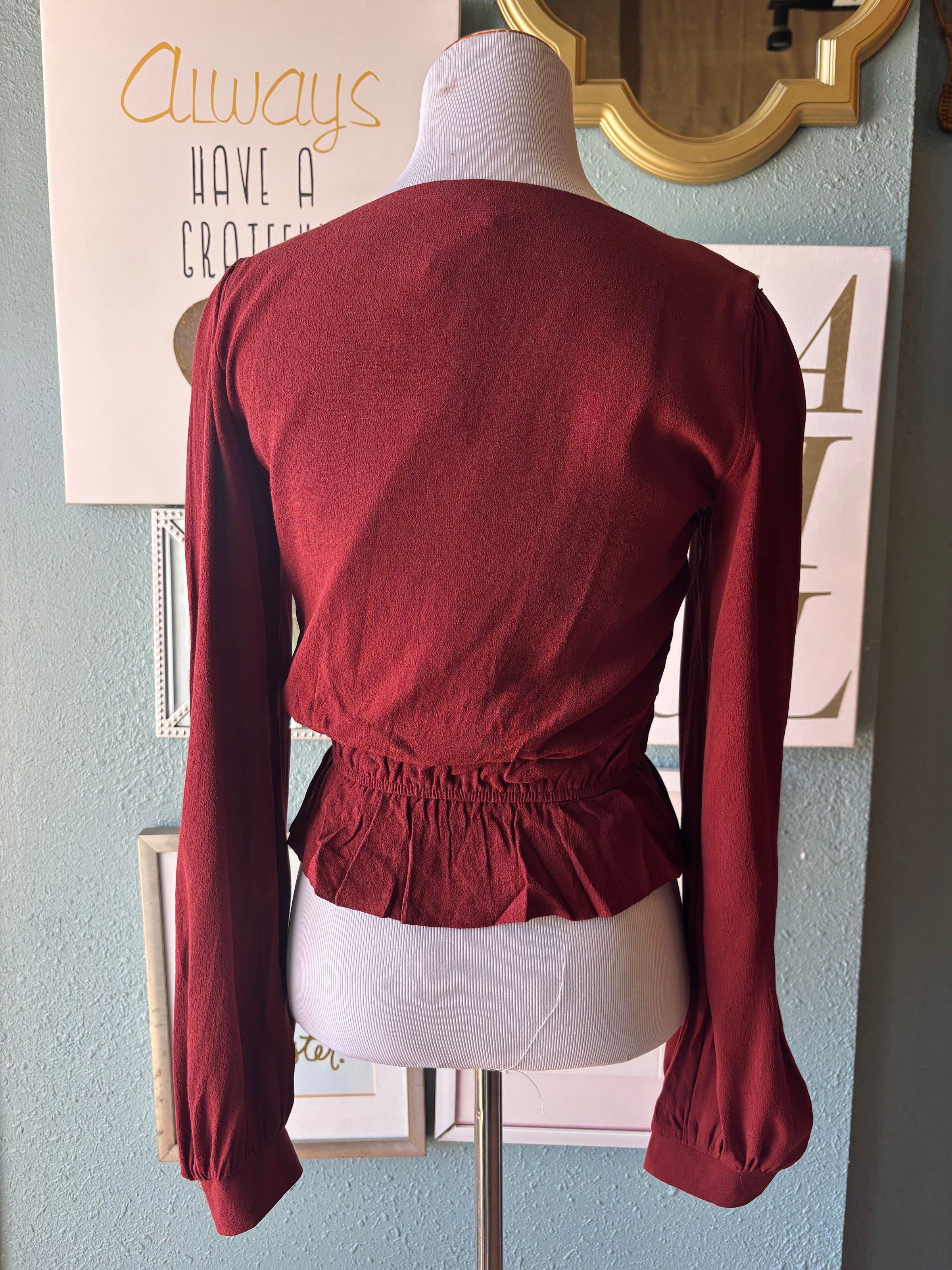 Olivaceous burgundy ruffle blouse