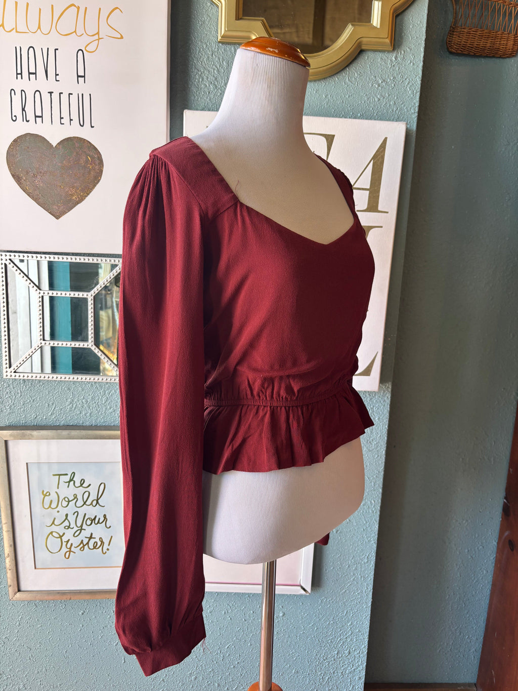 Olivaceous burgundy ruffle blouse